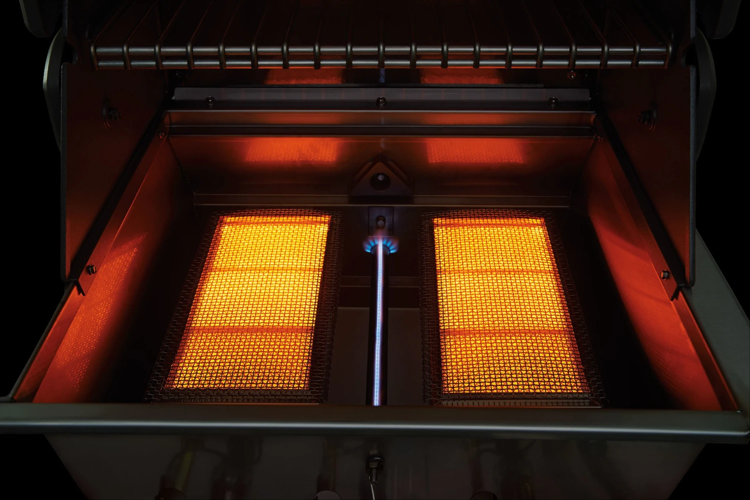 - Twee inwendige SIZZLE ZONE infraroodbranders tot 7,6kW met hiertussen geplaatste RVS brander tot 2,5 kW