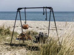 De Petromax Grillmand Gevogelte kan aan verschillende bevestigingspunten worden opgehangen, zoals een driepoot of een ander ophangsysteem. Het is ontworpen om buiten boven een open vuur, kampvuur of een ander hittebron te hangen.